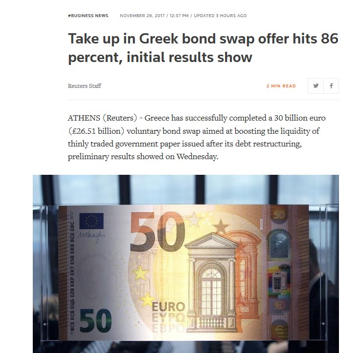 Στην επιτυχημένη ολοκλήρωση του swap ομολόγων ύψους 30 δισ. ευρώ αναφέρεται δημοσίευμα του Reuters.