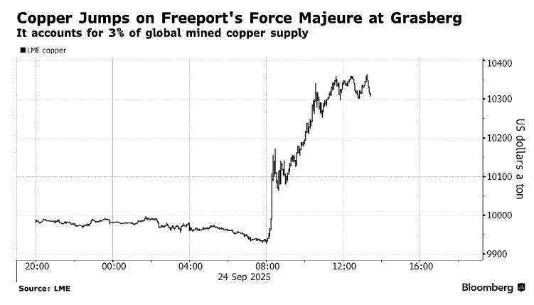 Ανωτέρα βία (force majeure) επικαλέστηκε για τα συμβόλαια προμήθειας χαλκού από το τεράστιο ορυχείο Grasberg στην Ινδονησία, τη δεύτερη μεγαλύτερη πηγή χαλκού παγκοσμίως, προκαλώντας εκτίναξη στις τιμές του μετάλλου ο μεταλλευτικός κολοσσός Freeport-McMoRan (FCX), σε αυτό που η ομάδα εμπορευμάτων της Goldman χαρακτήρισε ως «γεγονός μαύρου κύκνου».