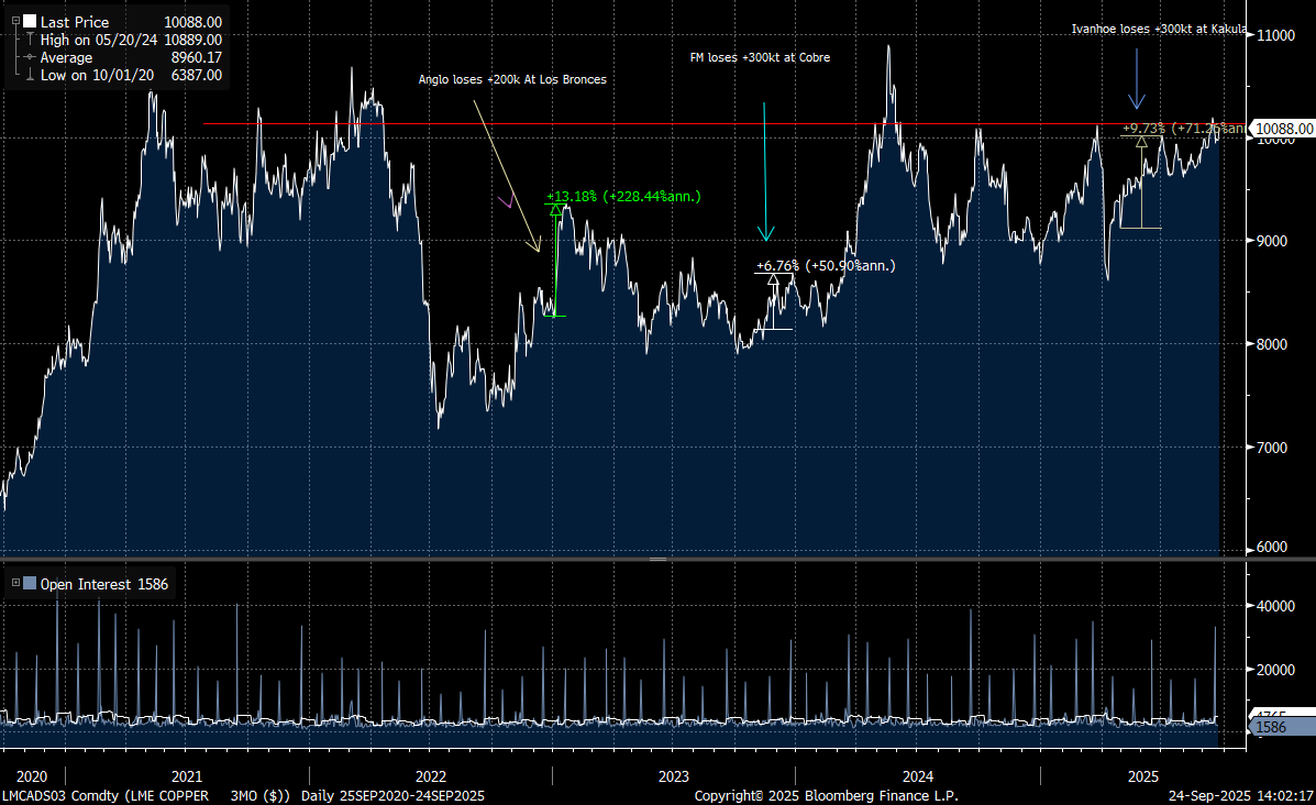 Υπάρχουν αντισταθμίσεις; Οι φετινές διακοπές είναι ~90 χιλ. τόνοι χαμηλότερα από την πρόβλεψή μας• πιθανόν να χαθούν ~150 χιλ. τόνοι φέτος, αν και ίσως να εξαχθούν αποθέματα από το ορυχείο, το λιμάνι ή το εργοστάσιο επεξεργασίας, εάν η Freeport λάβει άδεια από την κυβέρνηση της Ινδονησίας. Για το 2026 εκτιμούμε άλλες απώλειες 100–150 χιλ. τόνων. Πολύ σοβαρό. Οι τιμές αναμένεται να ανέβουν.