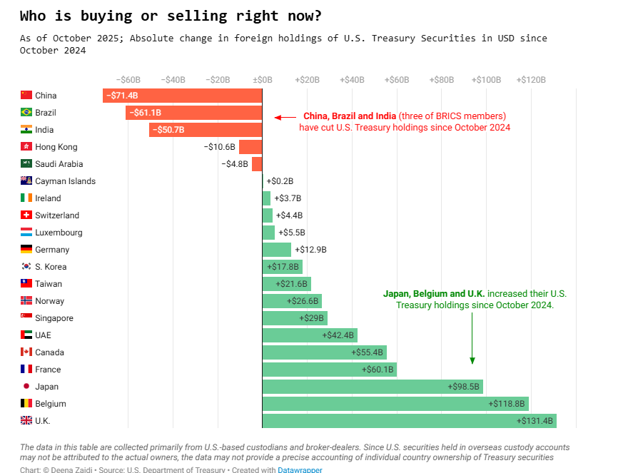 – Η Ιαπωνία και η Βρετανία διατήρησαν τη θέση τους ως οι μεγαλύτεροι κάτοχοι αμερικανικού χρέους, ενώ ο Καναδάς, η Νορβηγία και η Σαουδική Αραβία αναδείχθηκαν σε σημαντικούς αγοραστές, οδηγώντας τη συνολική αύξηση.