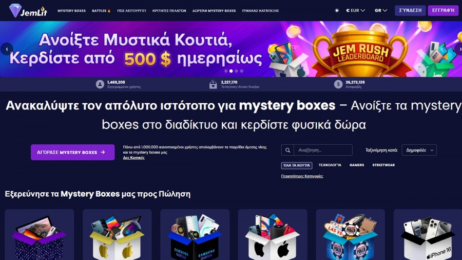 Το Jemlit είναι μια online πλατφόρμα όπου μπορείτε να αγοράσετε mystery boxes με σταθερή τιμή και απροσδιόριστο περιεχόμενο. Δεν αγοράζετε απευθείας ένα προϊόν, αλλά ανοίγετε ένα κουτί έκπληξη που μπορεί να περιέχει δώρα πολλαπλάσιας αξίας. Τα πιθανά έπαθλα περιλαμβάνουν ρολόγια Rolex, iPhone 16, προϊόντα ομορφιάς, συλλεκτικά anime, ρούχα, smartwatches, κονσόλες και πολυτελείς τσάντες, όλα με εντυπωσιακή ποικιλία και αξία.Οικονομικότερη λύση για προϊόντα μεγάλης αξίας σε συνδυασμό με την αδρεναλίνη από ένα live casino όπου όλα είναι πιθανά.